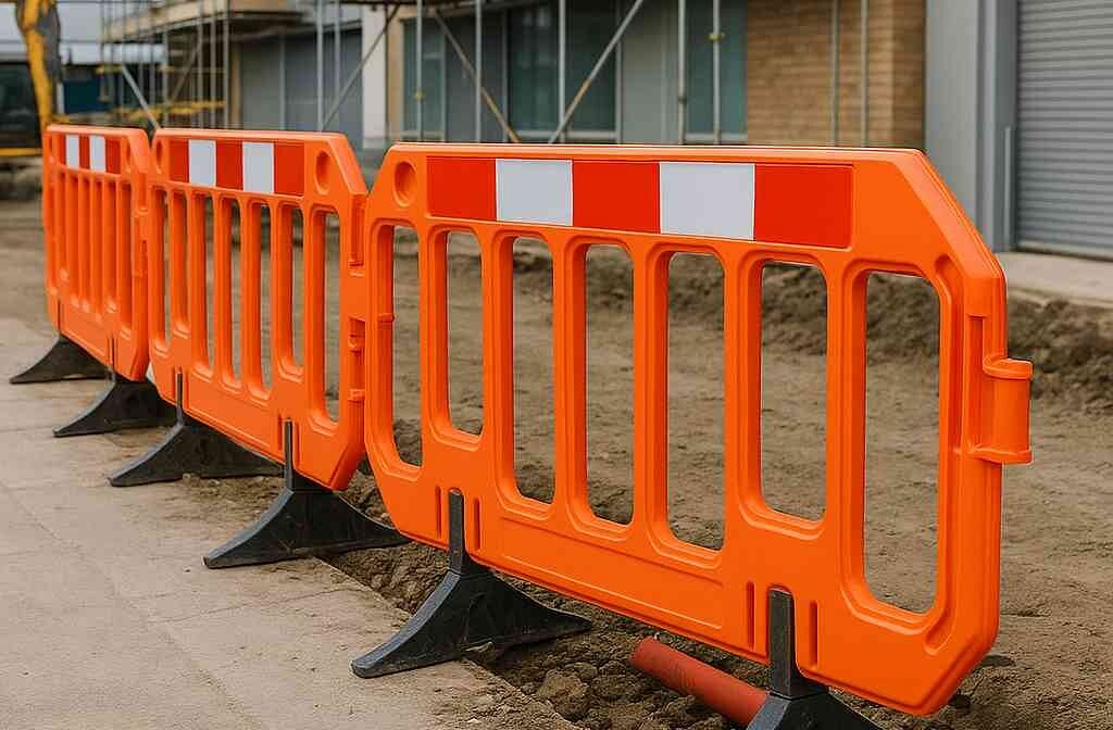 Durable and compliant Chapter 8 traffic barriers ideal for pedestrian and roadside safety, ensuring high visibility and secure work zones.