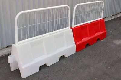 The red and white barriers are a clearly visible barrier used in construction site, events, road sectioning, road works and civil engineering.